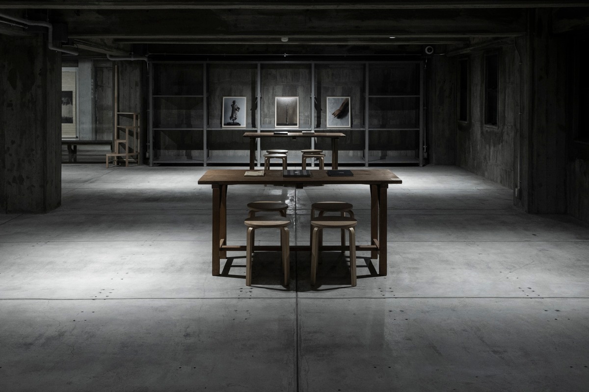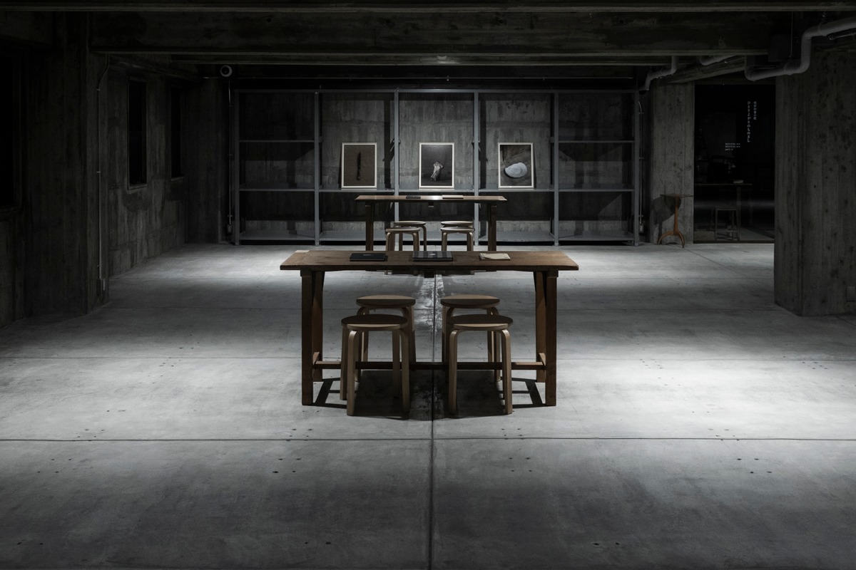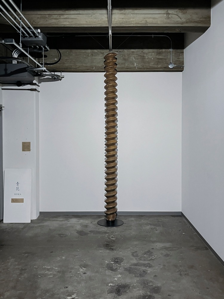 受付は1階です。入場券の確認後、通路奥の階段より3階へ上がってください。3階に、全出展者の展示があります。ちなみに階段の木製手すりも中村さんデザインで、故・坂田和實さんの美術館 as it is(中村さん設計)の階段手すりと同手です。また、通路つきあたりに立つ3米ほどの木の棒は、ブランクーシ《無限柱》の着想素としても知られるワイン圧搾機のネジで、彫刻家・豊福知徳『愉しき西洋骨董』所載品(同書は坂田さんの愛読書でした)。