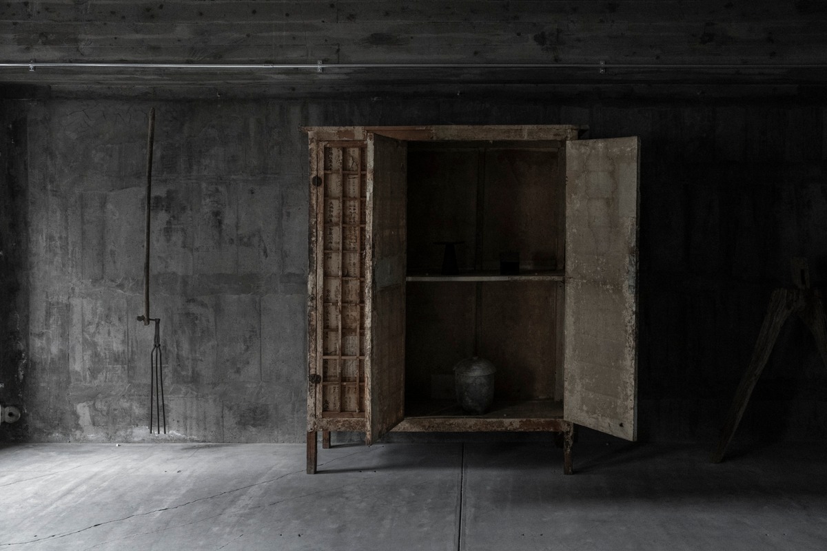 後期展示はじまりました。この棚をこの場所でもみることができてうれしい。紙貼棚(李朝時代)。〈いわゆる李朝の代表ではない。外れているけれど、美しいと思っています〉(坂田和實「フォルムと素材感」『李朝工芸』)─