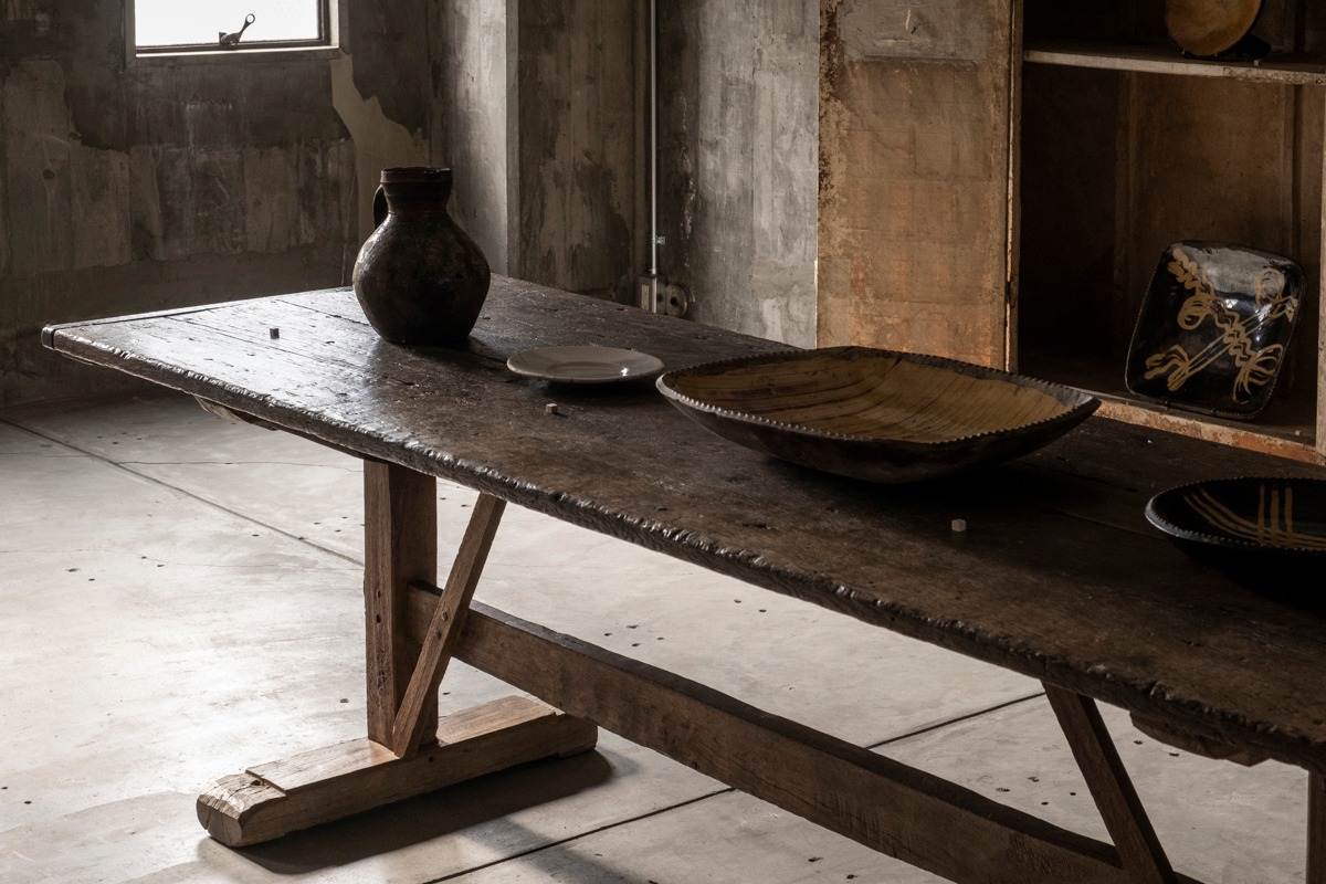 7世紀イギリスの長テーブル(とてもながい)。全体も細部も木味も、ほれぼれします。李朝の棚ともよくうつります。─