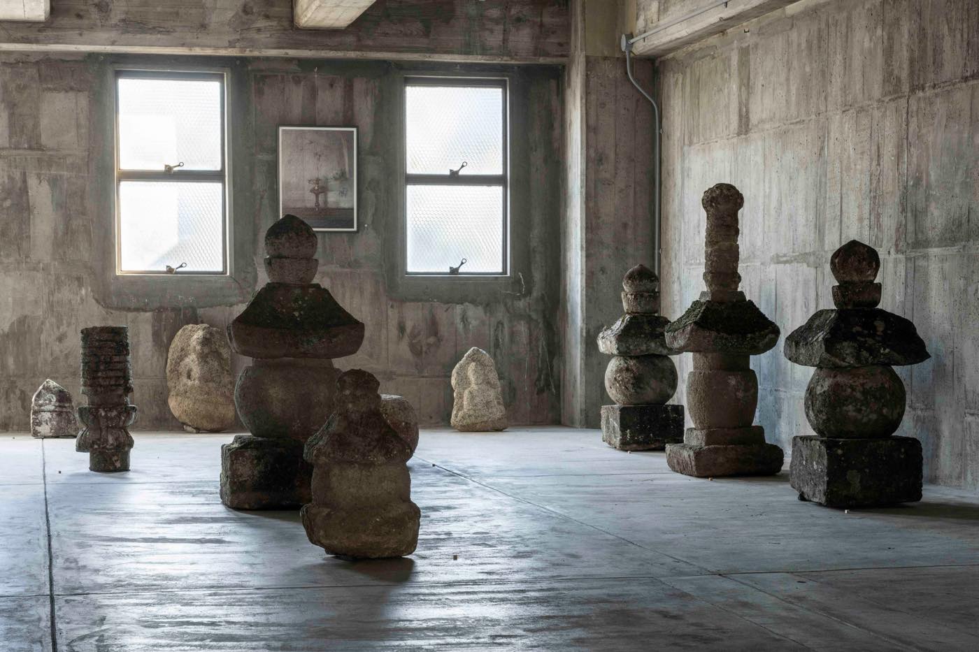設営終りました。五輪塔や宝塔が十数基、石仏も10体ほど、全体で約50点(販売あり)。ベテラン骨董商いわく「前例のない」展示に、たしかになった気がします(倉庫の床だからこそ、もふくめ)。国東の地にふたたび立つ思いでした。あさってから(25・26日は青花会員限定。ただし25日の講座参加者は当日御覧いただけます)。─────