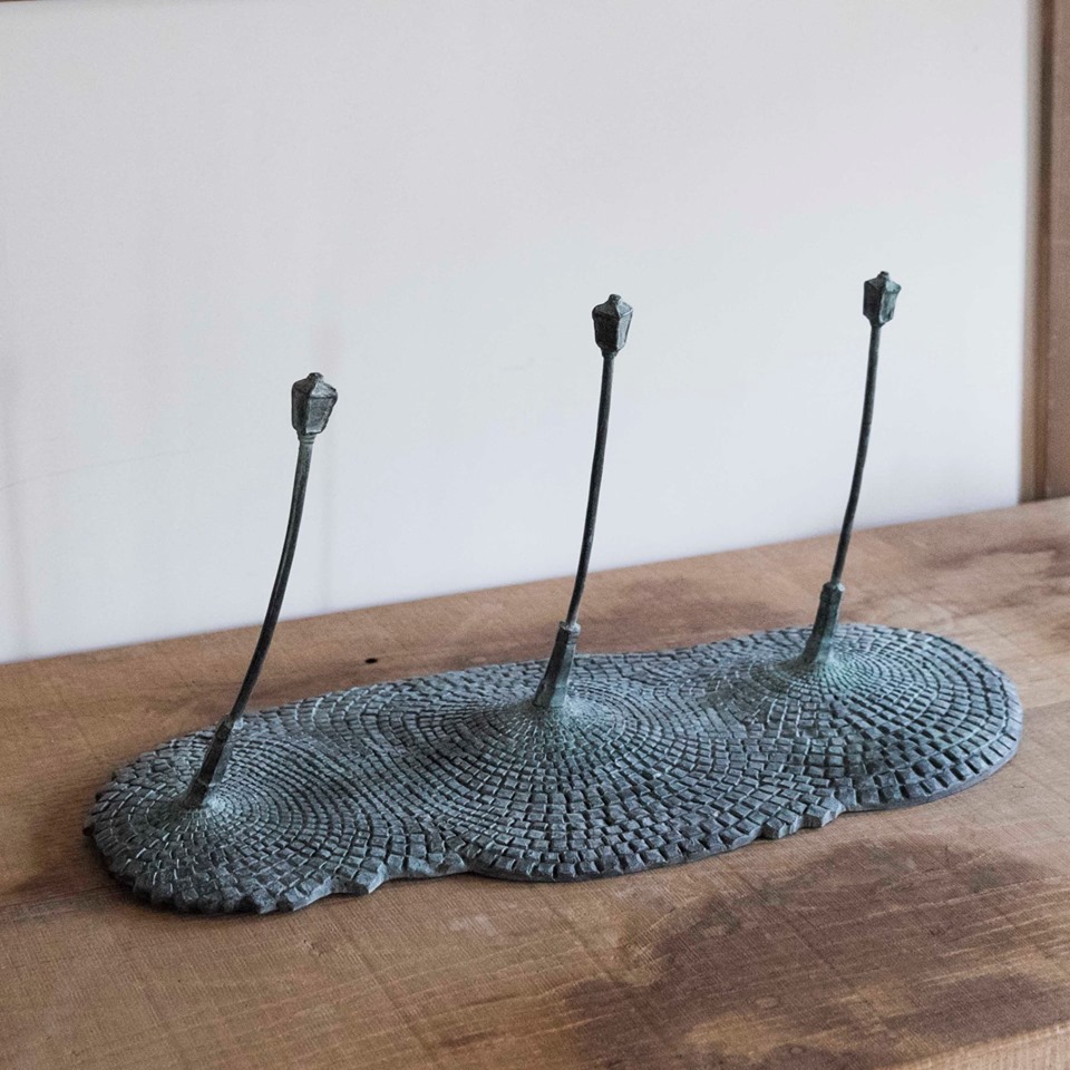 〈加藤朝美さんとは知りあって10年ほどですが、イタリアに行くと(あるいは加藤さんの帰国時に)必ず会うので、わたしは勝手に親戚のように思っています。ダジャレ好き、シベリアンハスキー似でダンディなブロンズ彫刻家です。ローマで会う加藤さんほど頼もしい存在はいません。町にとけこみすぎて、待合せしても見つからないほど! ローマについて、イタリアの人たちについて、加藤さんの話をうかがっていると、仕合せな生きかたって何だろうと考えさせられます。そんな加藤さんの作品の面白さは、彫刻で風景をテーマにしていること。風景画ではなく立体で造る。町への愛ゆえでしょうか。人の視点と俯瞰的視線が溶けあっています。ドロミテの山々からは森のざわめきが、ボローニャのポルティコからは石畳を歩く足音が聞こえてくるようでした。今回の展示は「ローマ」がテーマ。どんな作品が並ぶのか、いまから楽しみです〉
