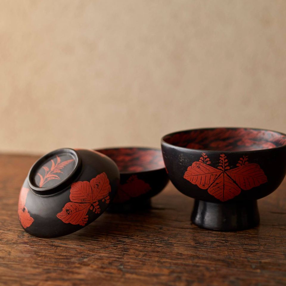 桃山文化の華やかさ、大胆さが絶妙な配図で表現された三ツ椀。赤×黒の鮮やかな「日本の漆の美」に目を見張ります。高台内に描かれた芦が効いてます。
