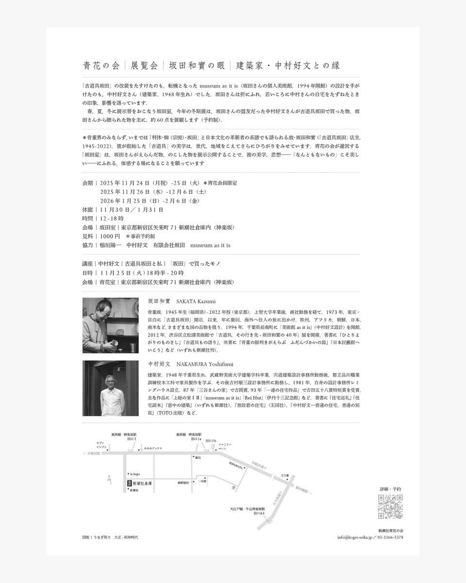 *骨董界のみならず、いまでは「利休・柳(宗悦)・坂田」と日本文化の革新者の系譜でも語られる故・坂田和實(「古道具坂田」店主。1945-2022)。彼が創始した「古道具」の美学は、世代、地域をこえてさらにひろがりをみせています。青花の会が運営する「坂田室」は、坂田さんがえらんだ物、のこした物を展示公開することで、彼の美学、思想──「なんともないもの」こそ美しい──にふれる、体感する場になることを願っています