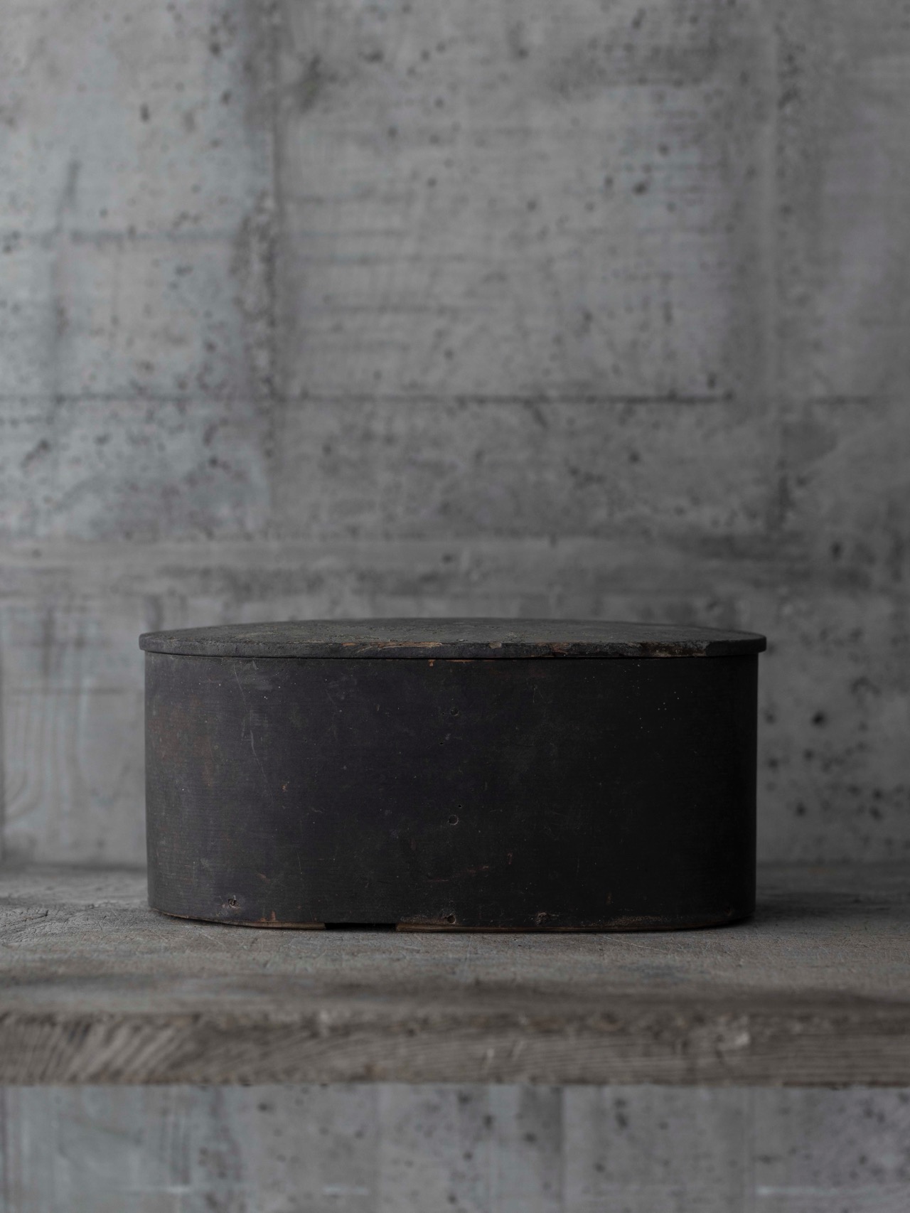 楕円形の曲物で、表は経年の煤にまみれ見事な枯れ具合です。蓋裏に「寛永七年……」(1630年)と墨書きされています。この白磁皿が実用に供されていた頃に、それを収めるために作られた曲物でしょう。