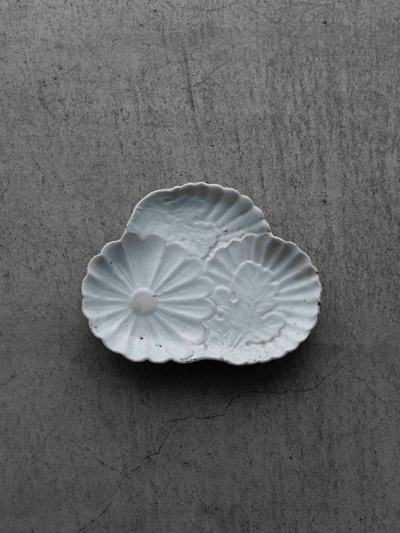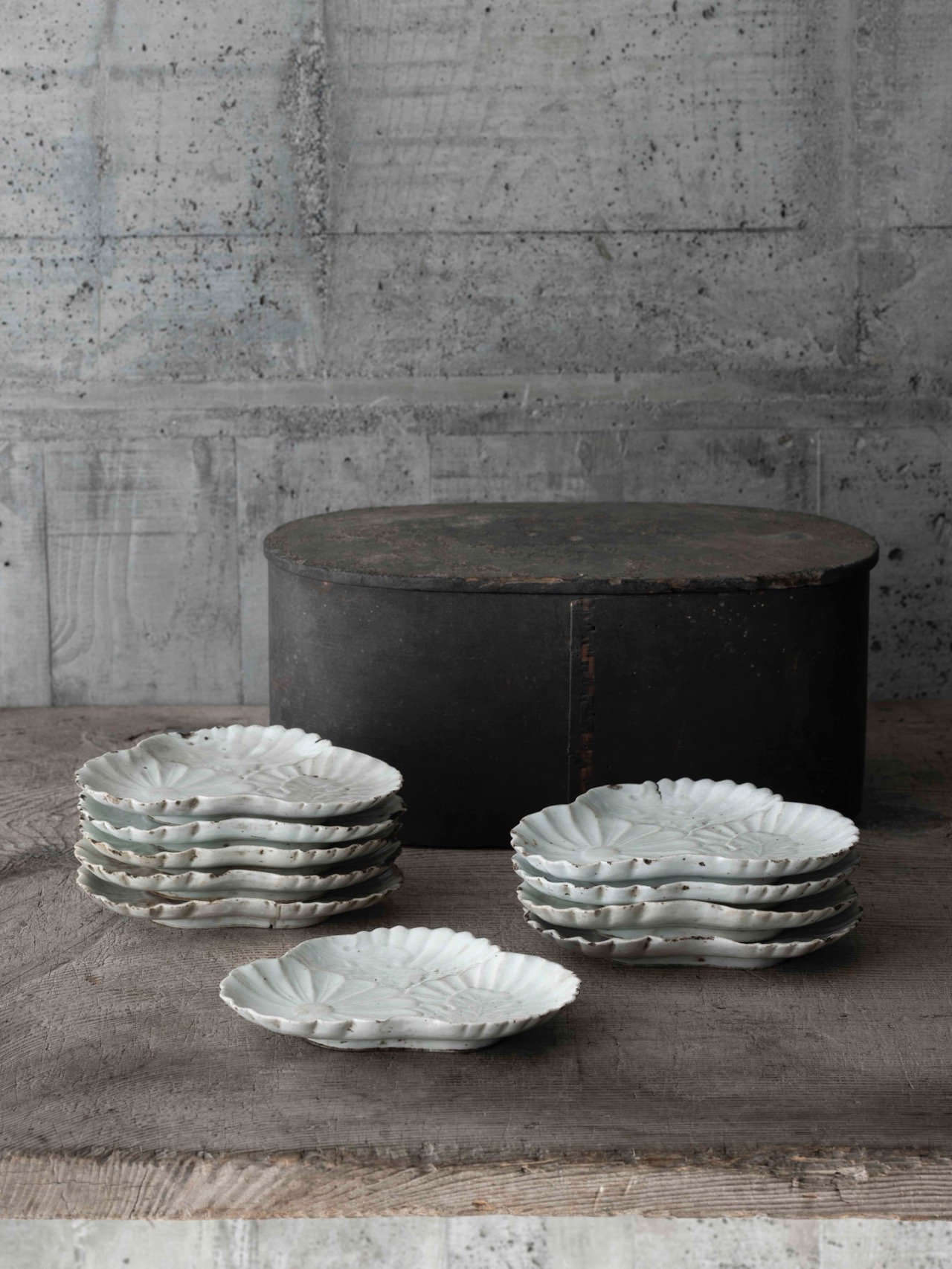 重陽の節句の頃に市場に現れた菊形の白磁皿です。伊万里全般が安くなった昨今、季節商品なら少しは需要があるはずと、この時期に出品されたのかも知れません。が、私が「これ」と思い定めて競り声を掛けたのは、菊皿の方ではなく、その容れ物(外箱)です。