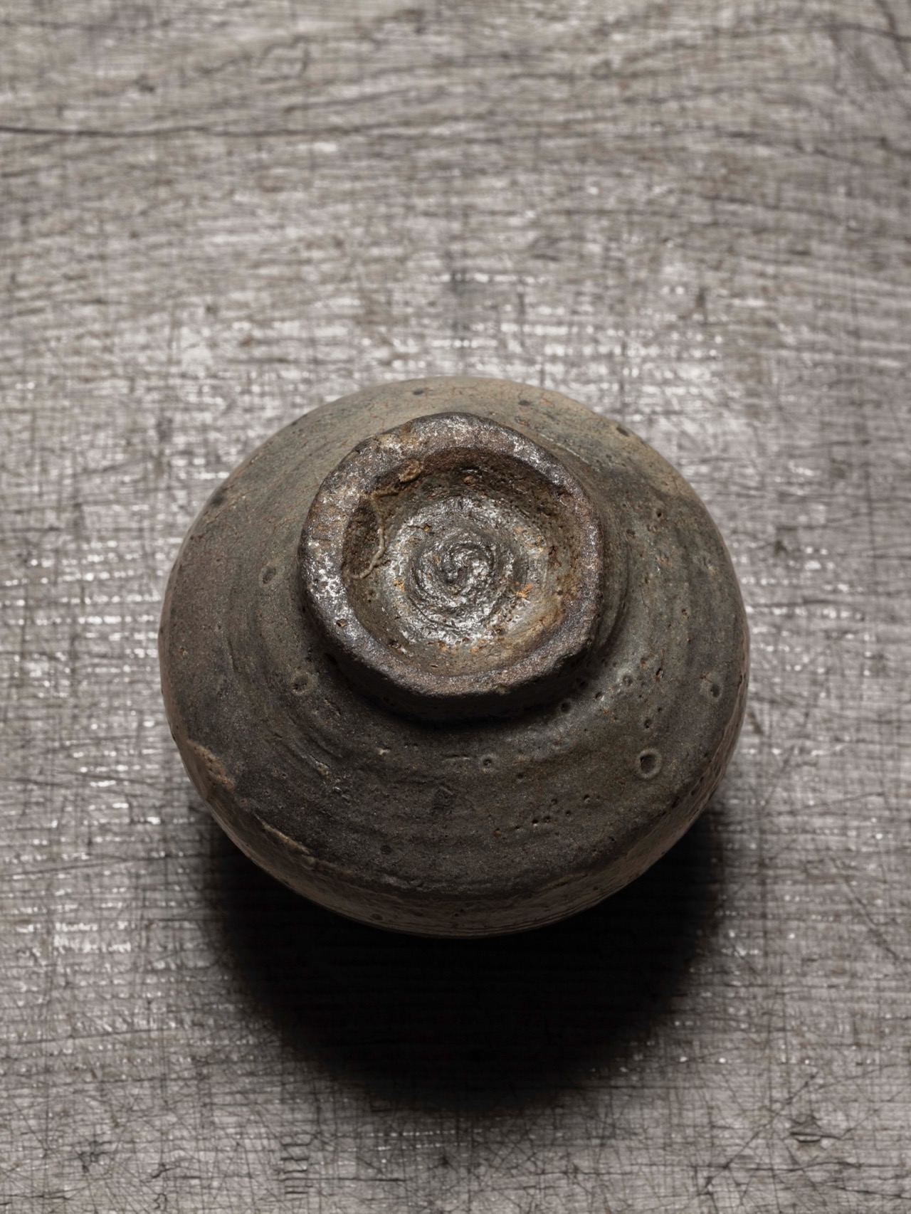 さて掲出の「塩笥茶碗」です。上掛けされた白釉にも深い味の付く伝世茶碗で、まさに当時の茶人が取り上げた、塩の入った小壺の風格です。雑器(入れもの)として酷使された時代のシミか、茶碗として長く使われてのシミか、私には判断ができませんが、いずれにしても幾百年の厳冬を越えてきた碗(小壺)に違いはありません。