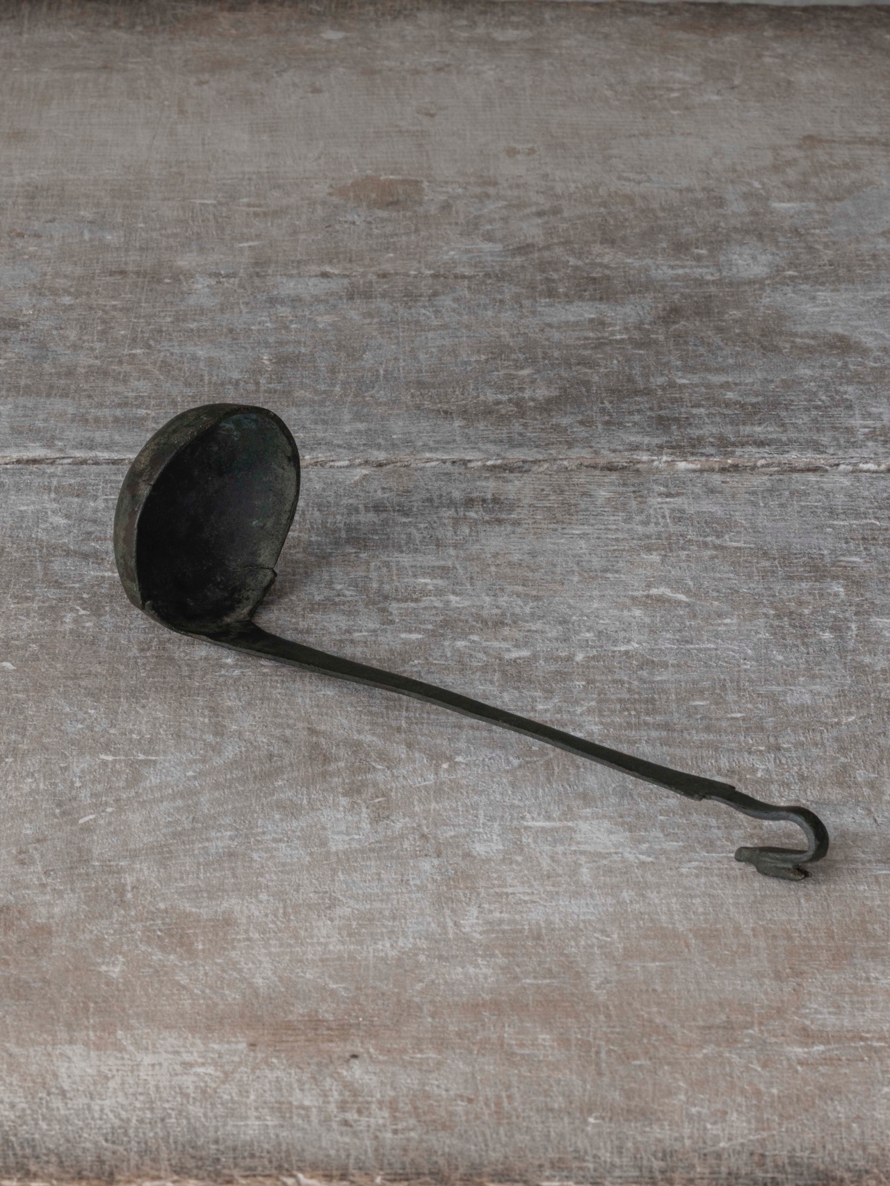 この古代ローマ(紀元前)のレードル(玉杓子)も、古道具坂田(坂田和實さん)の扱った品で、私たちの主催する交換会(集芳会)に出てきたものです。17世紀頃の西洋で使われたものと勝手に思っていたのですが、品に添付されたコピーがあり、似た品が載っていました。ローマ時代のイギリスのレードルで、紀元前後の品と知りました。そう思って眺めて見れば、柄の先端に施されている装飾の動物頭部も何やら意味ありげに見えてきますから、私の眼もいい加減なものです。花器にしたら……と思い立ち、加熱する競りに参加しました。