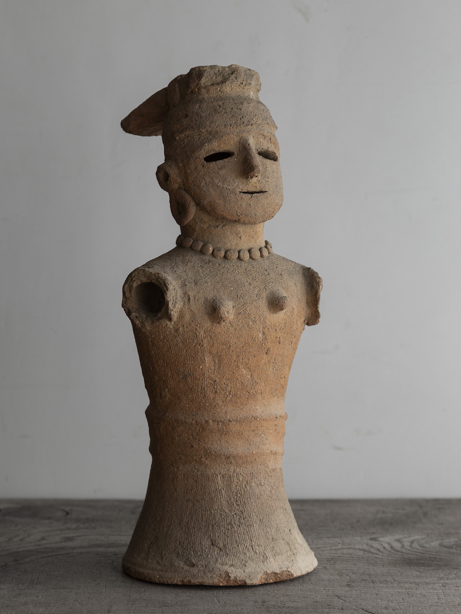 そして、古墳時代の象徴とも言える埴輪。豪族の墓である古墳は、国内外へ力を誇示するモニュメントでもあるわけですから、そこに並べられる埴輪は威信材としての意味も大きかったはずです。ところが、今に残る埴輪を眺めると、その多くは強さとかけ離れた優しい姿で、表情には憂いをも感じてしまいます。