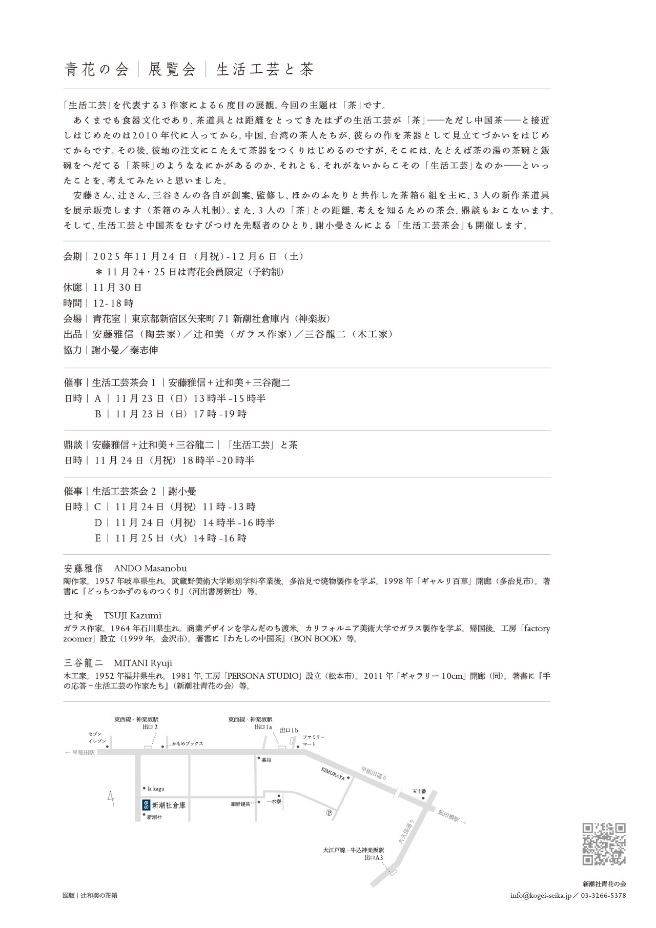 安藤さん、辻さん、三谷さんの各自が創案、監修し、ほかのふたりと共作した茶箱6組を主に、3人の新作茶道具を展示販売します(茶箱のみ入札制)。また、3人の「茶」との距離、考えを知るための茶会、鼎談もおこないます。そして、生活工芸と中国茶をむすびつけた先駆者のひとり、謝小曼さんによる「生活工芸茶会」も開催します。